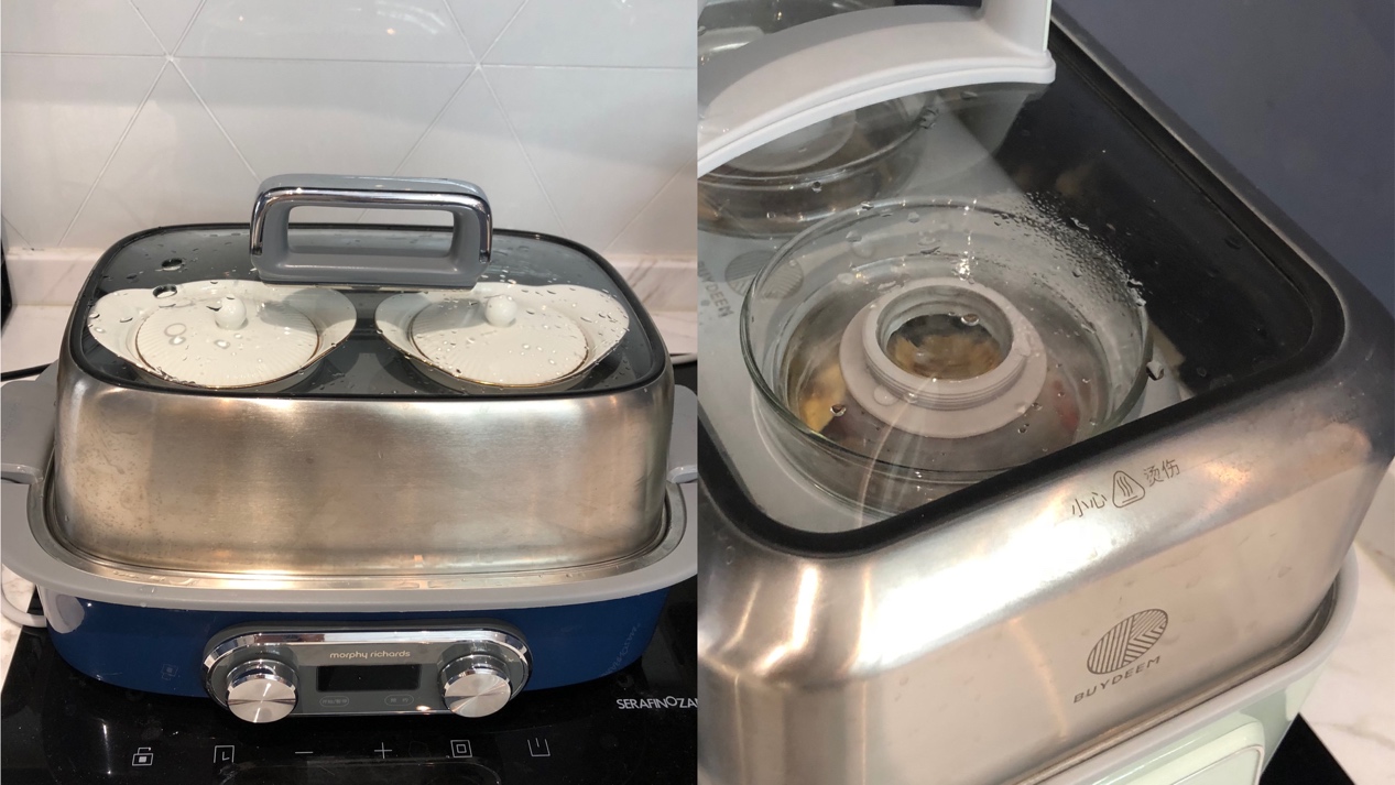 另外,摩飞的拿放炖盅也比较方便,只要1、2步就可以体面完成,而北鼎的需要多步才可以,北鼎将炖盅直接放在发热储水区,在拿放时炖盅底部会滴水(甚至是油水),操作麻烦不优雅!