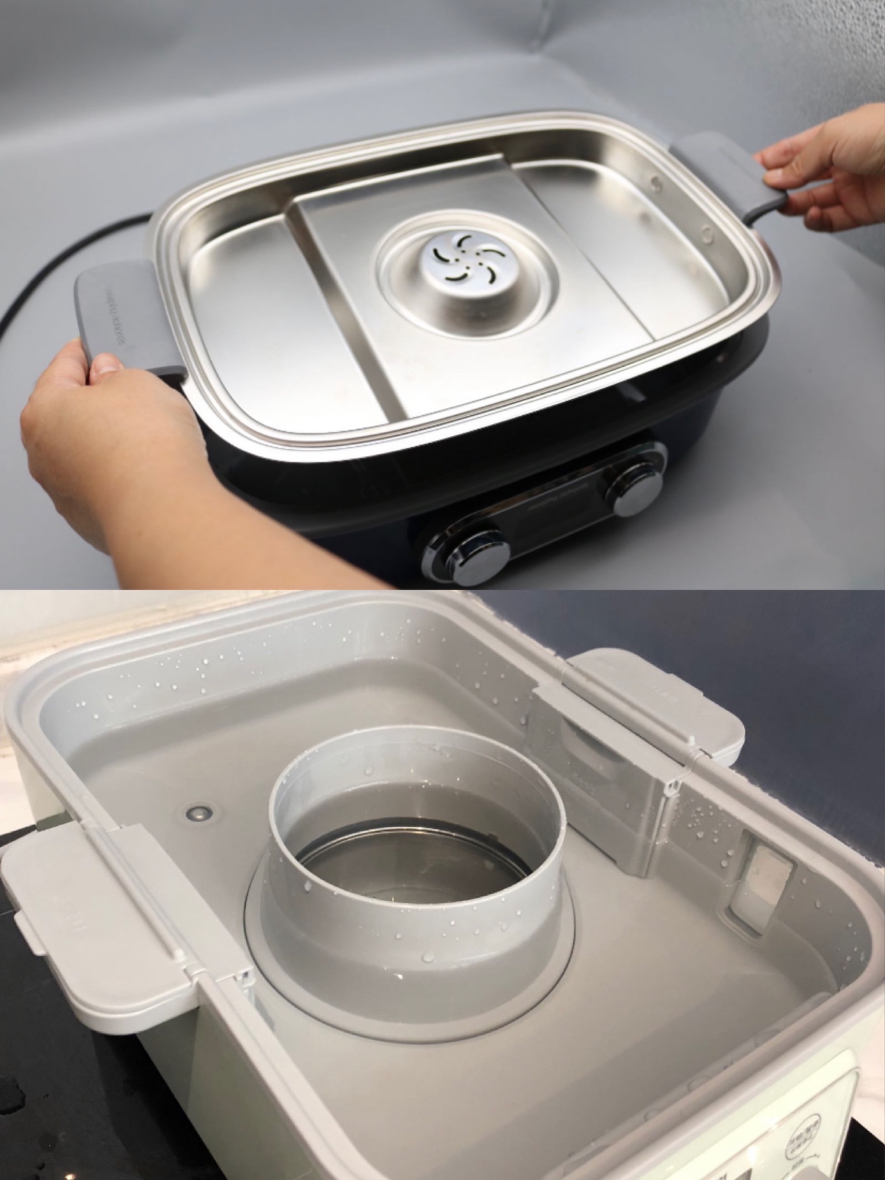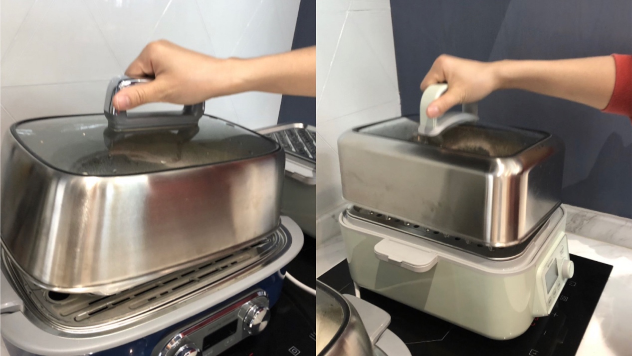两款锅都有独立积汁盘设计,都能做到脏水净水分离,食材一直蒸也会一直鲜。