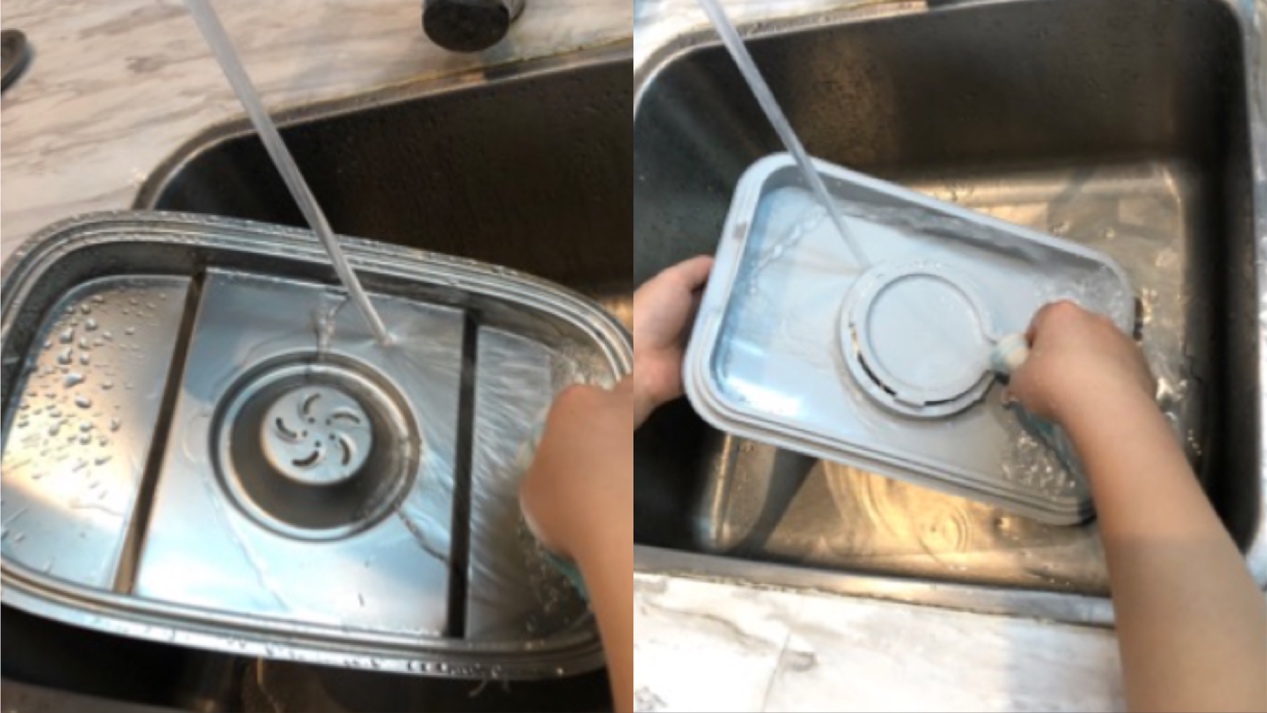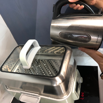 另外,摩飞的积汁盘有两个把手,拿起就可以加水,锅内储水容量可以连续蒸40min,之后再换水蒸出来的品质会更佳。