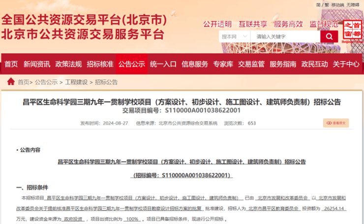 8月27日,北京市公共资源交易服务平台发布昌平区生命科学园三期九年一贯制学校项目招标公告,北京市发展和改革委员会提前核准昌平区生命科学园三期九年一贯制学校项目勘察设计招标方案。招标人为北京市昌平区教育委员会,投资额约为2.6亿元,该项目由政府100%主导并出资建设。