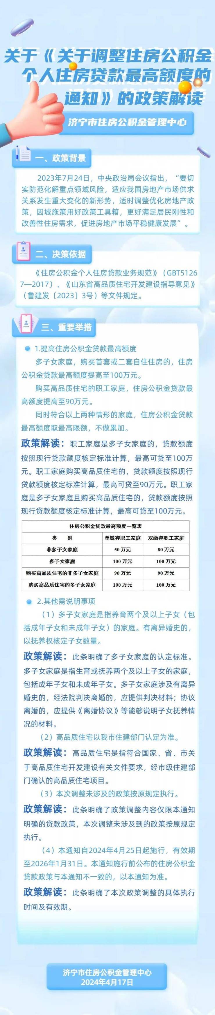 对此,济宁市住房公积金管理中心解读指出,职工家庭是多子女家庭的,贷款额度按照现行贷款额度核定标准计算,最高可贷至100万元。职工家庭购买高品质住宅的,贷款额度按照现行贷款额度核定标准计算,最高可贷至90万元。职工家庭是多子女家庭且购买高品质住宅的,贷款额度按照现行贷款额度核定标准计算,最高可贷至100万元。