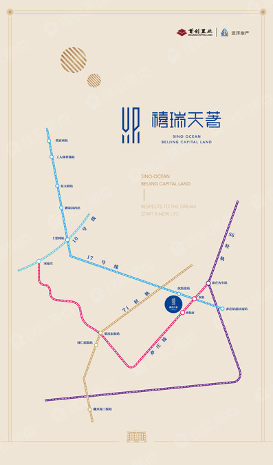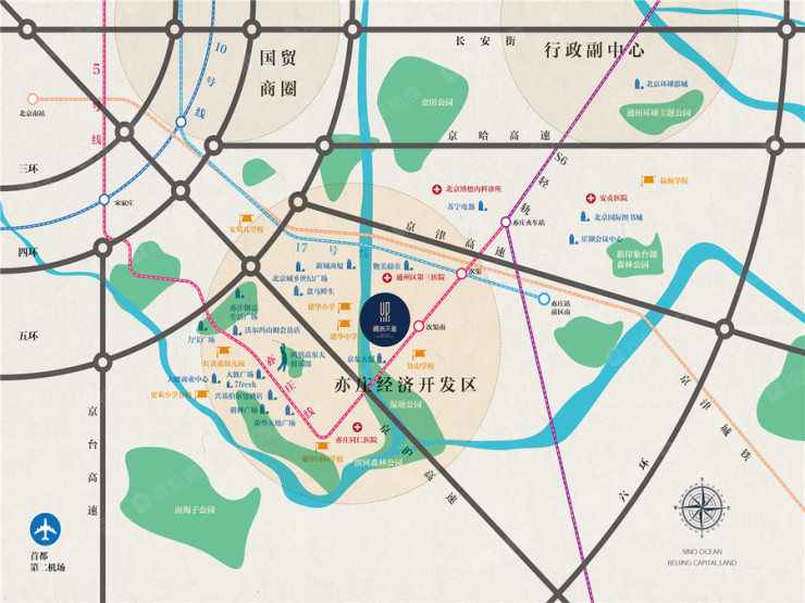 首创远洋禧瑞天著地处五环腹地,据守地铁亦庄线次渠南站200米,周边亦庄线、17号线、S6轻轨、T1四轨道紧密围合,京津、京沪双高速贯通,京津城铁快速直达,多维交通路网无缝接驳世界繁华,享受真正意义上城市的黄金经济线。