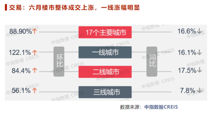克而瑞方面认为,6月是验证各城市市场成色的重要节点,并给下半年市场定调。在各地放松政策不断加码的情况下,房地产市场有望逐渐复苏,但城市分化加剧。两类城市成交有望明显改善:其一,市场供求基本平衡,包括上海、北京、深圳、杭州、成都等,供应放量必然成交明显回升;其二,放松政策力度较大的城市,如太原、无锡、南通等,短期或将刺激居民购房消费,成交有望企稳回升。