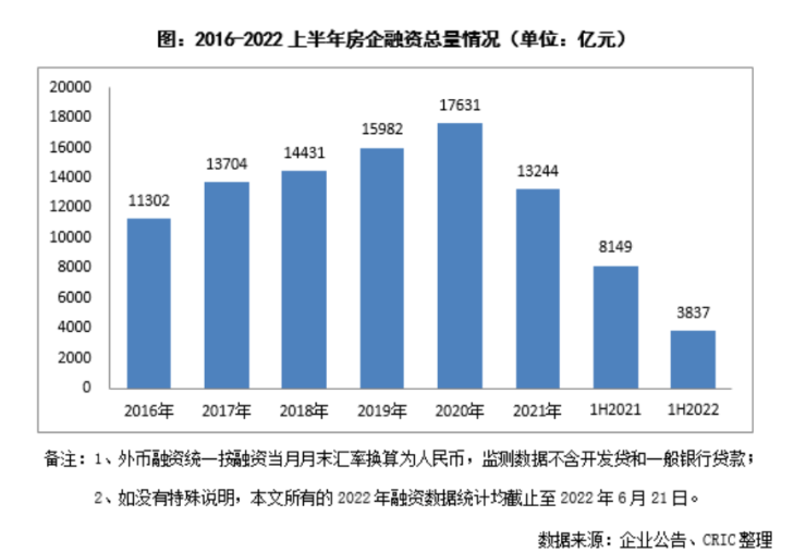 克而瑞统计显示,从历年100家典型房企的融资总量来看,2021年出现了近五年来的首次负增长,融资总量13244亿元,同比下降了25%;进入2022年融资规模的下滑趋势仍在扩大,上半年100家典型房企的融资总量为3837亿元,同比下降53%。