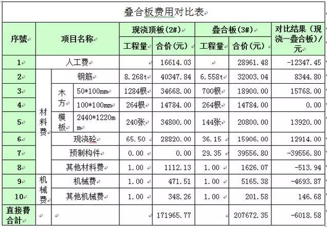 经济对比:通过以上经济分析对比可以看出,目前从综合经济效果上,叠合板施工与常规全现浇顶板施工相比,综合成本每层增加6018.58元,主要原因是:
