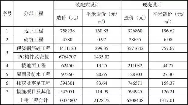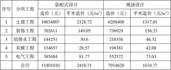 从上表可以看出,同一住宅建筑,装配式设计平米建安费用比现浇设计平米建安费用高出783.94元,其中,土建工程高出811.71元。不难发现,两种施工方式造价差异主要集中在土建工程上。