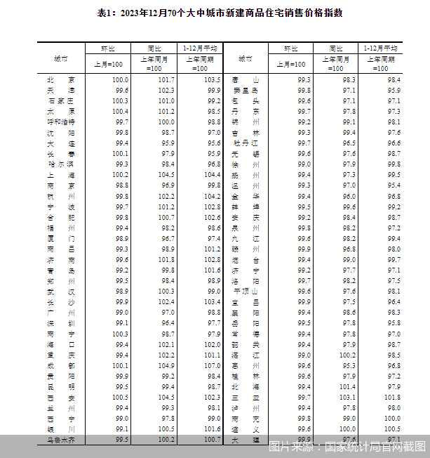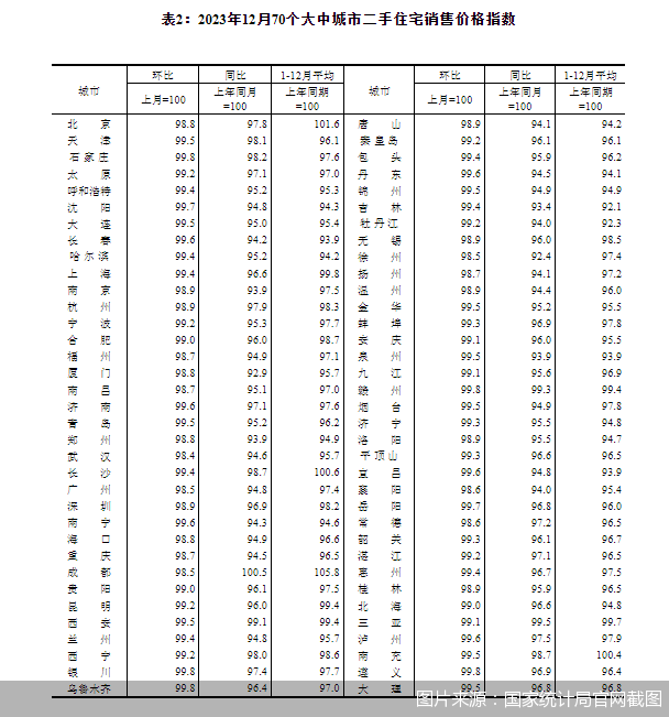 2023年12月,市场延续降温态势,房价下行压力进一步加剧。国家统计局数据显示,12月70个城市二手住宅价格环比全部下跌,无一环比上涨和持平城市,这也是自2014年10月以来首次70个城市全部下跌。