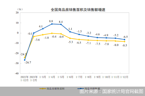 同日,国家统计局也发布了2023年全国房地产市场基本情况,数据显示,2023年商品房销售面积111735万平方米,比上年下降8.5%,其中住宅销售面积同比下降8.2%。2023年商品房销售额116622亿元,同比下降6.5%,其中住宅销售额同比下降6%。