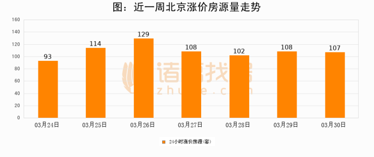 根据诸葛找房数据显示,北京24小时涨价房源量为107套,较03月29日减少1套,环比下降0.9%。与此同时,涨价房源占比小幅回落,对于购房者来说是一个入市窗口期,购房者可抓住时机入市。