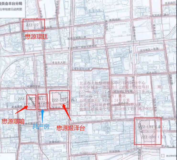其中27地块也就是懋源璟廷位于丰台北路北侧、08地块懋源璟瑜及07地块懋源煜泽台位于东大街西七里庄路上;大家可以看下方这张详细的规划图↓