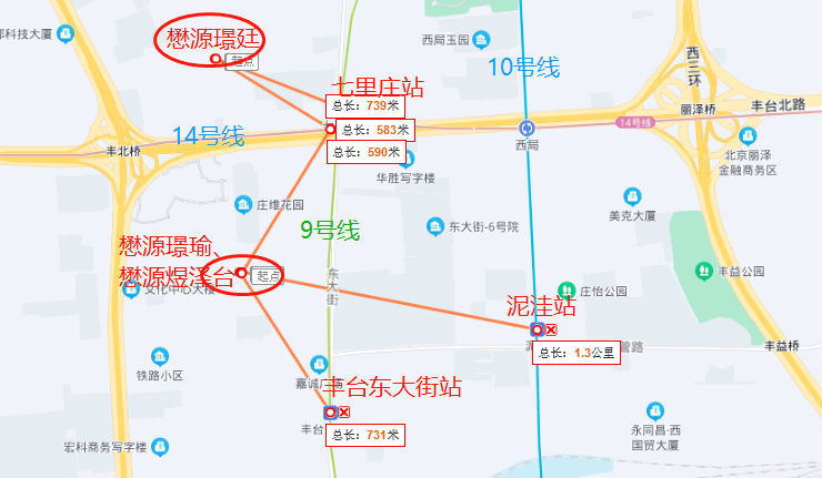 璟瑜及煜泽台距离9号线丰台东大街站730米左右、10号线泥洼站1.3公里左右;