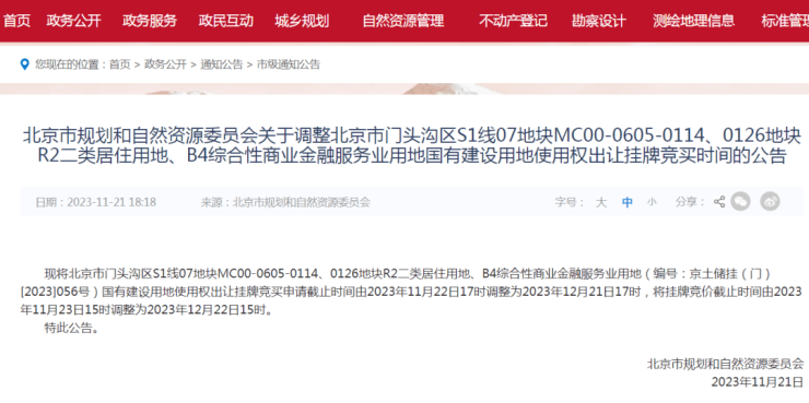 11.23延期出让(至12.22日)|门头沟S1线07地块0114、0126地块