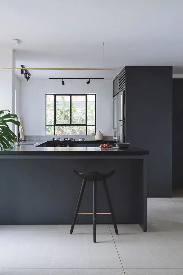 环绕式的厨房吧台提供更多的储物空间,因为厨房长年处于潮湿情况,全部采用黑色台面的样式,清洁起来更加方便。厨具内嵌入橱柜内部,也不会占据太多空间。特地还在内部墙面处开了一扇窗户,透光透气效果好。