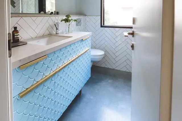 别看卫生间空间比较小,确是五脏俱全应有尽有。洗漱台做悬空样式下加储物柜,没有卫生死角的同时增加储物空间,一旁的角落空间塞进一个马桶刚刚好。为了做好防水,还给周围的一圈墙面全部铺上瓷砖,美观的同时保护墙面不受腐蚀。