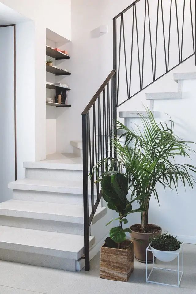 楼梯边空间也不放过,拐角处墙面打上悬空置物架,摆上装饰物或者作为存储空间都可以,简直不浪费1平空间。
