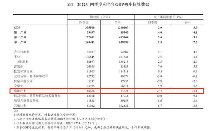 数据显示,2022年第四季度房地产业GDP为18466亿元,比上年同期下降了7.2%;2022年全年房地产业GDP为73821亿元,比上年同期下降5.1%。