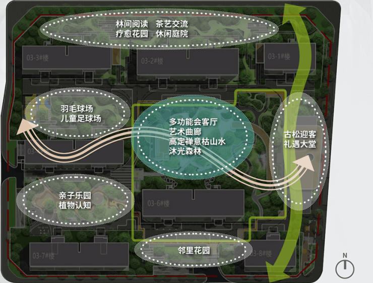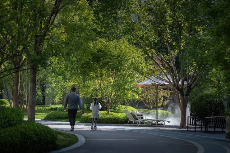 从百米 “尊享礼遇、静享自然” 归家轴,到繁花簇拥的宅间花园,为归家注入仪式感;横向延展的都市精奢花园街区,金属格栅与野趣花境碰撞出独特美学,让商业自然生长为森系生活剧场。340米林氧漫享环如活力纽带串联社区,跑道上的二十四节气文化标识流转时光韵律,科学布局的健身区、休憩区,让孩童嬉戏、青年奔跑、长者漫步的身影共绘全龄活力图景。而 6000㎡山水中庭则以禅意山水为底色,于此休憩品茗、风雅会晤,俯瞰全园盛景。