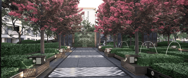 五大秘境花园,勾勒全龄生活剧场。「迎松门」约60米恢弘门庭,迎客古松伴行,奢石景墙映衬,彰显归家第一重尊贵礼序。