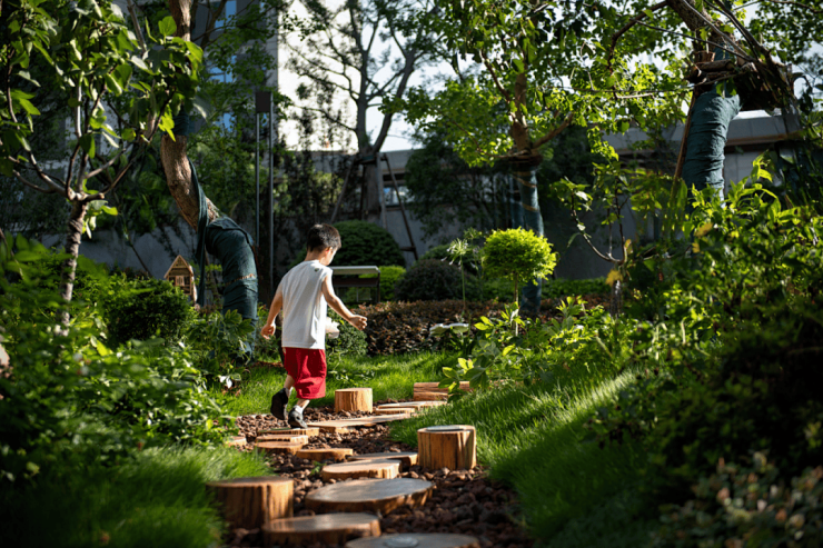 漫步其间,每一个细微处皆被赋予收藏级设计语言:街角花园,消弭建筑与自然的边界,成为城市肌理中可呼吸的休憩秘境;雨水花园,以雨水生态循环装置激发儿童对大自然的兴趣;科普乐园的植物光谱标识、可再生能源模型,则将自然规律转化为沉浸式互动体验;儿童场地中,色彩斑斓的滑梯、沙坑与攀爬架错落分布,欢声笑语在绿荫间久久回荡。