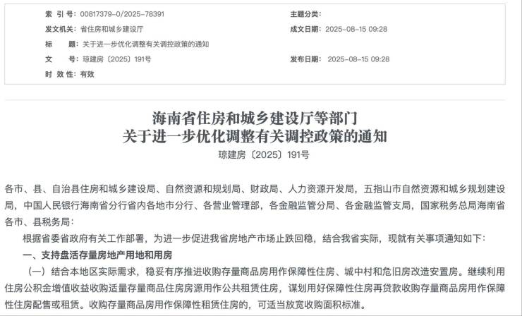 8月15日,海南发布《关于进一步优化调整有关调控政策的通知》(以下简称《通知》),涉及存量资产盘活、财税金融支持、取消普通住宅和非普通住宅标准、加大人才住房保障等多个维度。