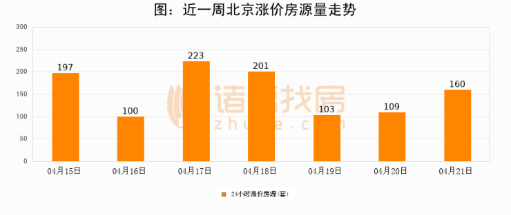 根据诸葛找房数据显示,北京24小时涨价房源量为160套,较04月20日增加51套,环比上涨46.8%。与此同时,涨价房源占比小幅扩大,业主信心有所提升。