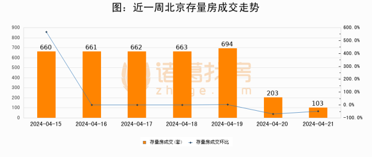 从存量房来看,2024年04月21日北京存量房单日成交103套,比昨日减少100套,环比下降49.3%。从近一周存量房成交来看,北京存量房日均成交套数为520套,04月21日单日成交103套,低于近一周平均水平80.2%。