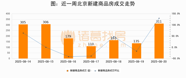 根据北京市住房和城乡建设委员会数据显示,2025年08月20日北京新建商品房成交311套,较昨日增加176套,环比上涨130.4%