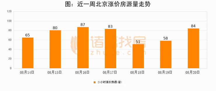 根据诸葛找房数据显示,北京24小时涨价房源量为84套,较08月19日增加26套,环比上涨44.8%。与此同时,涨价房源占比小幅扩大,业主信心有所提升。