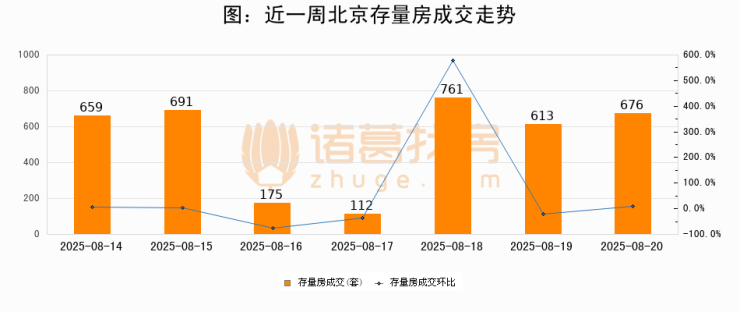 从存量房来看,2025年08月20日北京存量房单日成交676套,比昨日增加63套,环比上涨10.3%。从近一周存量房成交来看,北京存量房日均成交套数为526套,08月20日单日成交676套,高于近一周平均水平28.5%。
