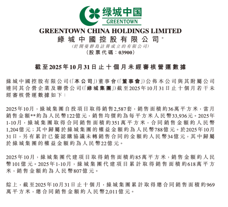 11月6日,绿城中国控股有限公司公布截至2025年10月31日止十个月未经审核营运数据。