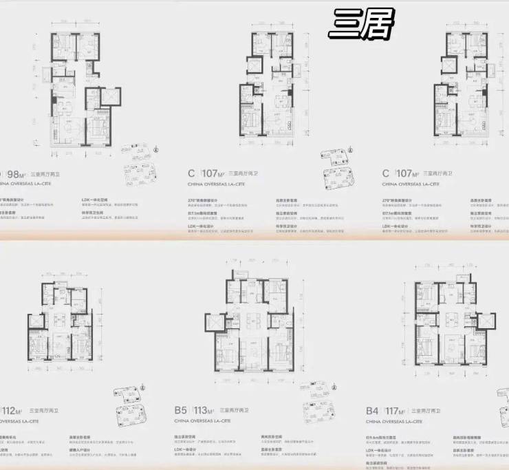 还有中海开发的另一个楼盘「中海·寰宇未来」,户型很多样:88-94两居、98-107-112-113-115-117三居和143-145四居