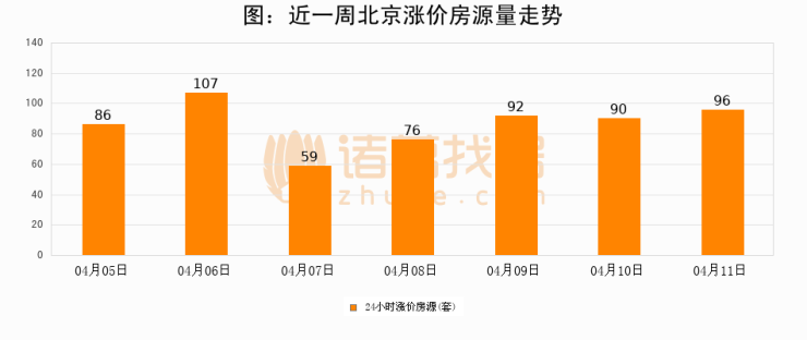 根据诸葛找房数据显示,北京24小时涨价房源量为96套,较04月10日增加6套,环比上涨6.7%。与此同时,涨价房源占比小幅扩大,业主信心有所提升。