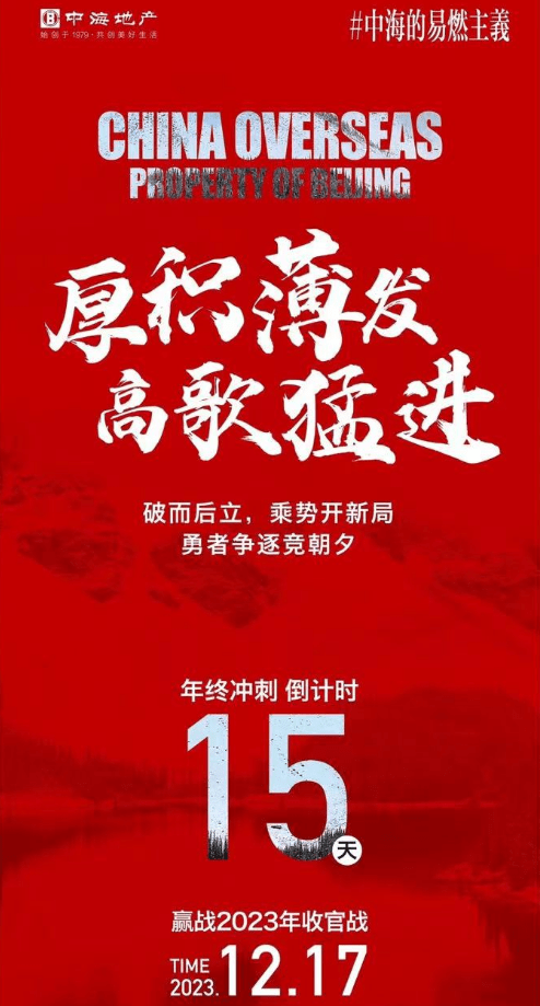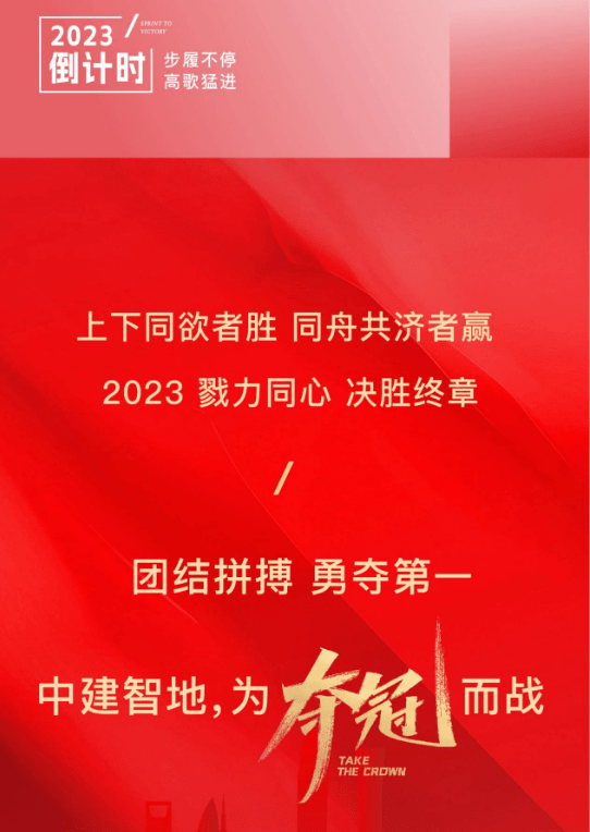 12月18日,中建智地官微发布海报,主题是“冲刺2023,为夺冠而战!”以及“战到底”“再超越”“团结拼搏,勇夺第一”等推广语。
