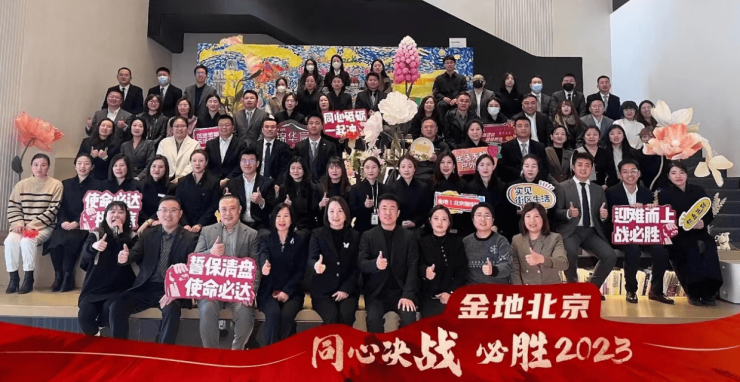 每经记者了解到,12月初,金地集团北京公司就举行了年终冲刺誓师动员大会,主题是“同心决战,必胜2023”。在一些关于大会的海报合影中,还能看见“誓保清盘,使命必达”字样的手牌。