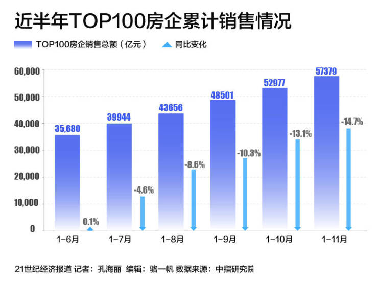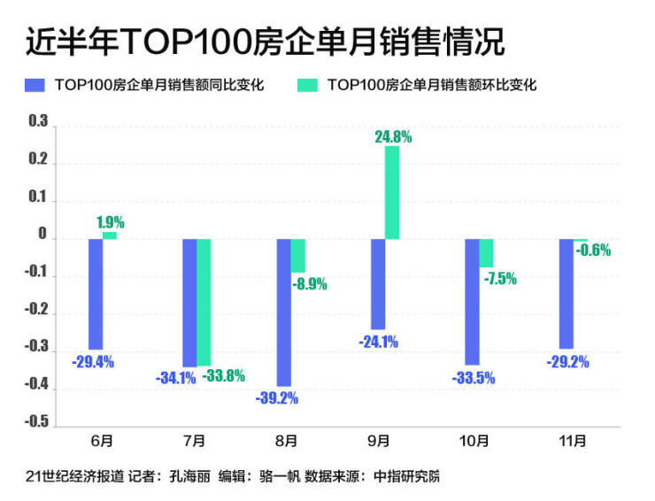 11月,多地楼市情绪趋弱,百强房企销售额继续下行。