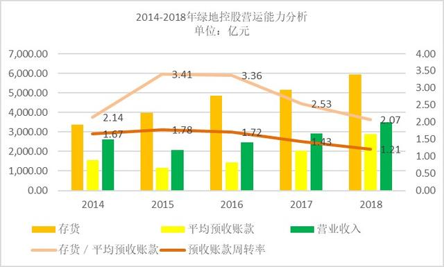 存货方面,近几年绿地控股的存货是逐年增加的,由2014年的3360亿元增长至2018年的5955亿元,较2017年的5147亿元同比增长了15.7%;公司预收账款2017年首次突破2000亿元达到2374亿元,2018年继续增长42.46%至3382亿元。