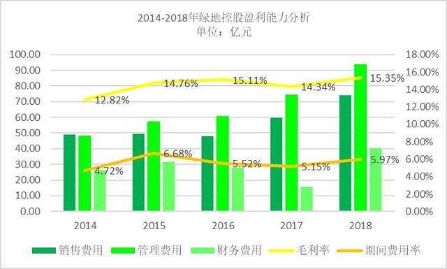 2018年,绿地控股期间费用率为5.97%,较2017年5.15%上升了15.83%,显示了绿地控股较好的期间费用控制能力。