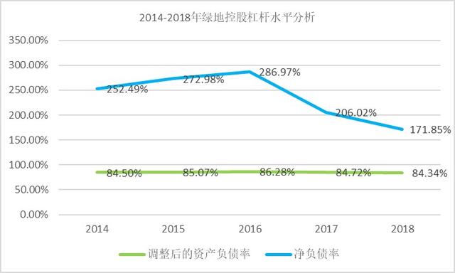 近五年绿地控股调整后的资产负债率一直高位运行,2018年该项指标数值为84.34%,为近五年较小值,较2017年的84.72%下降了0.44%,与行业其他公司相比,绿地控股杠杆水平偏高;净负债率方面,2018年绿地控股该项指标数值为171.85%,较2017年的206.02%下降16.59%,同样处于行业高位。综合上述两项指标,显示绿地控股较高的杠杆水平。