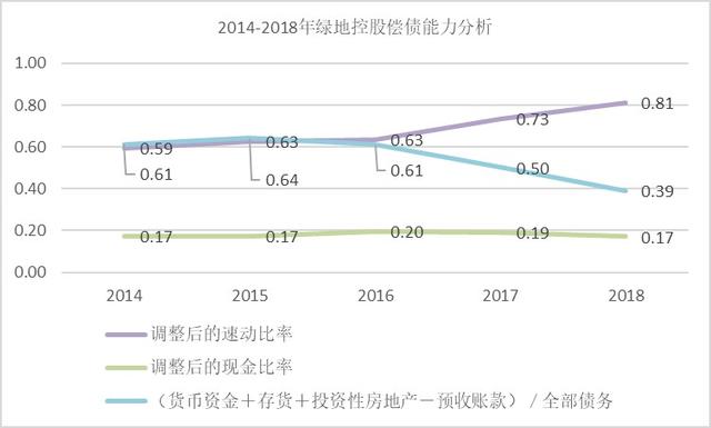 反映企业短期偿债能力有两项指标“调整后的速动比率”和“调整后的现金比率”。绿地控股调整后的现金比率近五年比较稳定,围绕0.17-0.20之间波动,2018年的调整后的现金比率为0.17,较 2017年的0.19同比下降了11.13,行业排名处于低位;调整后的速动比率2018年为0.81,较2017年的0.73同比上升了10.74%,行业排名靠后。绿地控股短期偿债能力并不乐观。