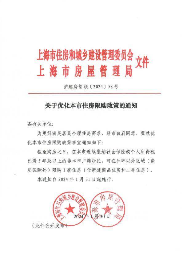 刚刚,上海市住房城乡建设管理委、市房屋管理局联合印发《关于优化本市住房限购政策的通知》,规定自1月31日起,在本市连续缴纳社会保险或个人所得税已满5年及以上的非本市户籍居民,可在外环以外区域(崇明区除外)限购1套住房,以更好满足居民合理住房需求,促进区域职住平衡、产城融合。