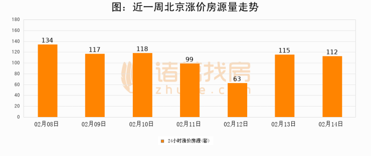 根据诸葛找房数据显示,北京24小时涨价房源量为112套,较02月13日减少3套,环比下降2.6%。与此同时,涨价房源占比小幅回落,对于购房者来说是一个入市窗口期,购房者可抓住时机入市。