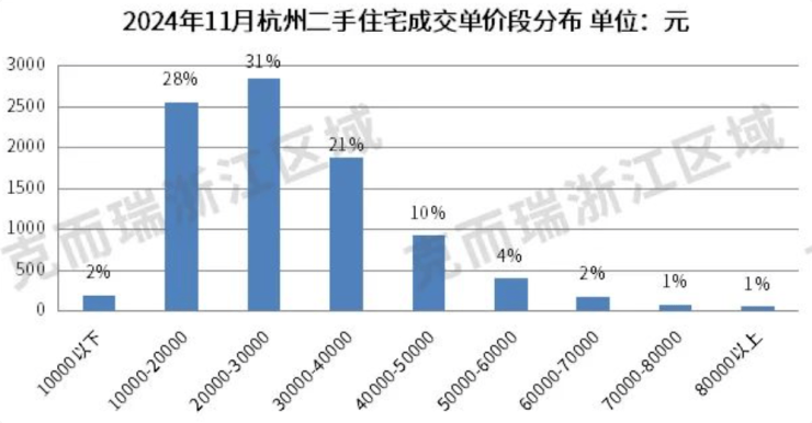 单价方面,杭州二手房成交依旧主要集中在2万—3万元/平方米房源,占比约31%;其次是1万—2万元/平方米房源,占比约28%。面积方面,70—90平方米面积段的房源成交占比居前,约为37%;90—110平方米面积段的房源成交占比垫底,约为12%。