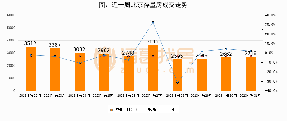 存量房方面,第31周北京存量房成交2718套,较上周增加56套,环比上涨2.1%。从近十周成交走势来看,周均成交套数为2972套,本周低于平均水平8.5%。