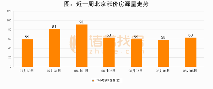 根据诸葛找房数据显示,北京24小时涨价房源量为63套,较08月04日增加5套,环比上涨8.6%。与此同时,涨价房源占比小幅扩大,业主信心有所提升。