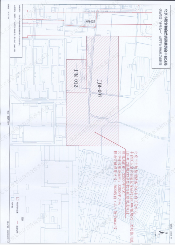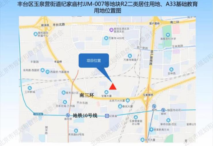 该地块位于丰台区内,共由两个地块组成。分别是:丰台区玉泉营街道纪家庙村JJM-007地块、JJM-012地块,用地性质为:R2二类住宅用地,A33基础教育用地。总用地规模为33500平方米,总建筑规模为85400平方米。