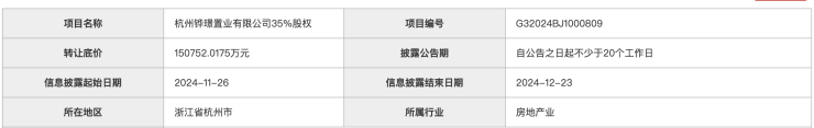 11月26日,据北京产权交易所披露的信息,杭州铧璟置业有限公司35%股权挂牌转让,转让底价约15.075亿元,转让方为杭州招雅企业管理有限公司,所属行业为房地产业。