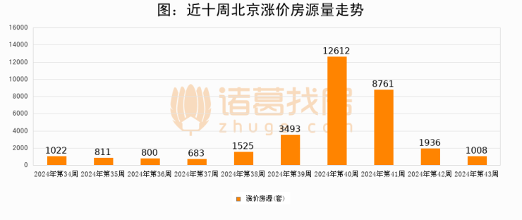 从调价房源来看,第43周北京涨价房源1008套,较上周下降47.9%。与此同时,43周涨价房源占比提升0.6个百分点,业主信心持续恢复。