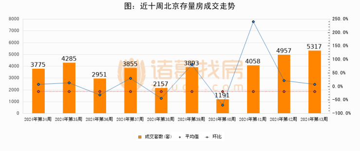 存量房方面,第43周北京存量房成交5317套,较上周增加360套,环比上涨7.3%。从近十周成交走势来看,周均成交套数为3643套,本周高于平均水平46%。