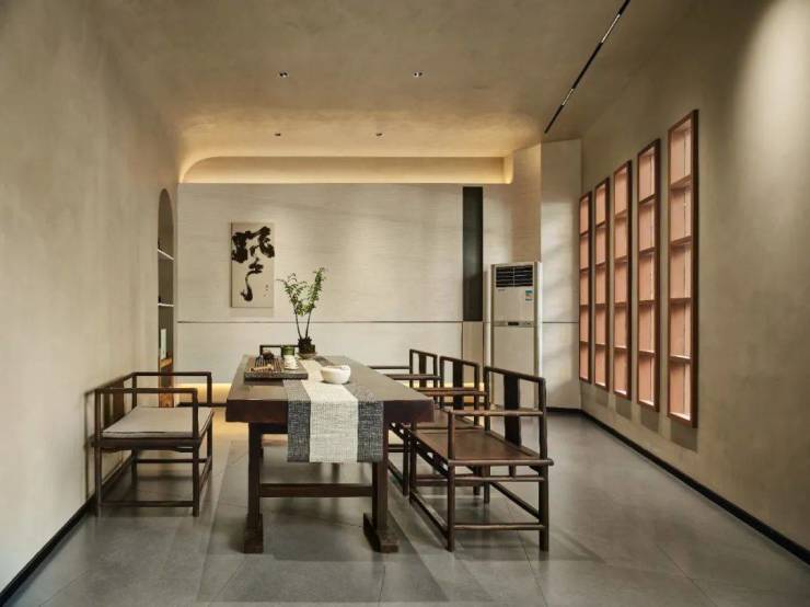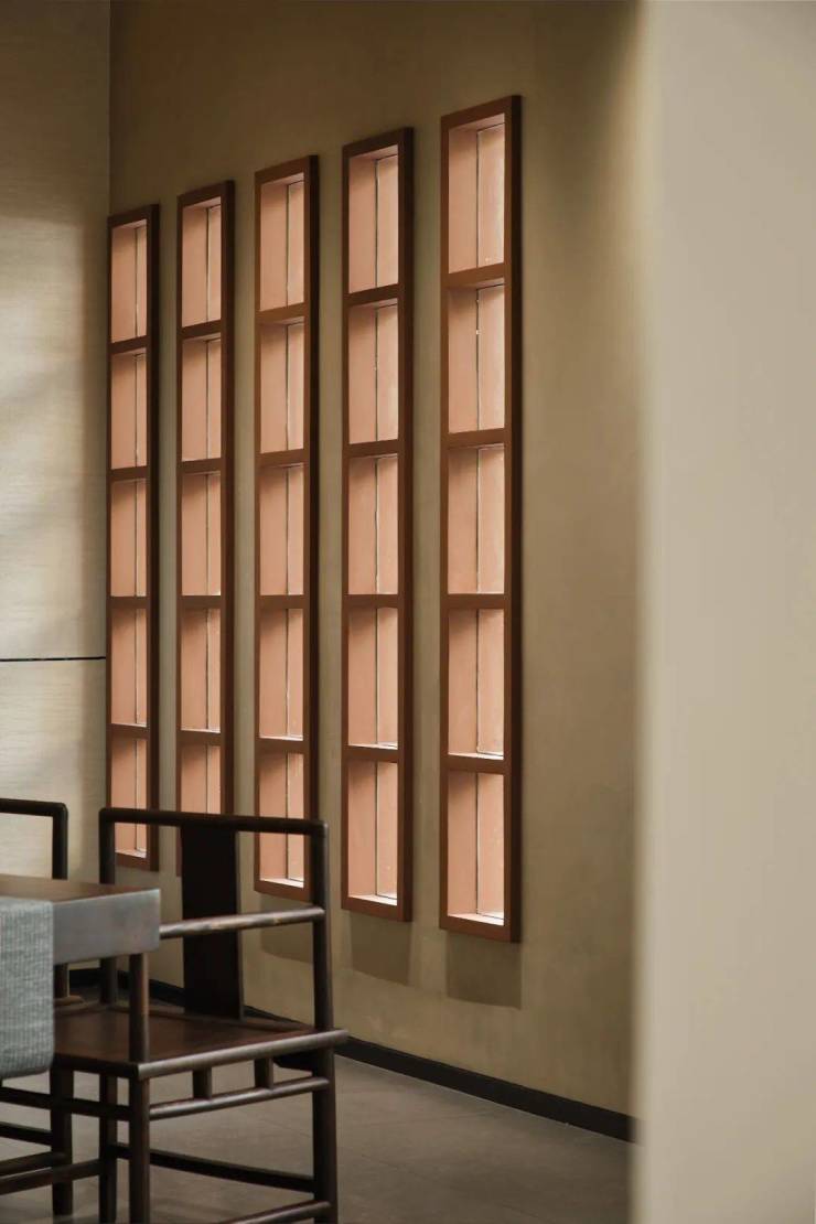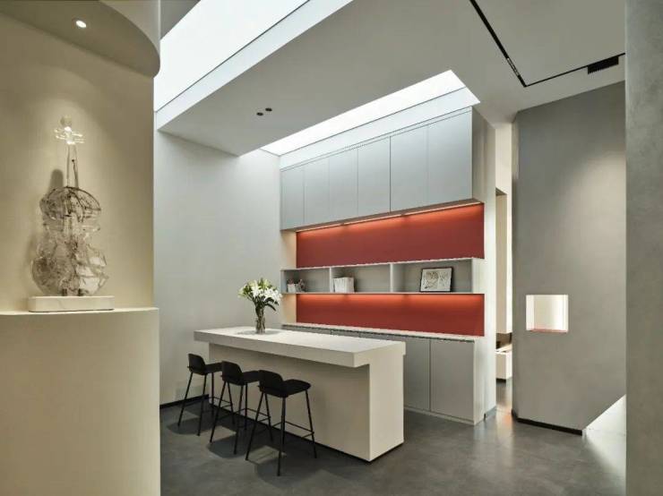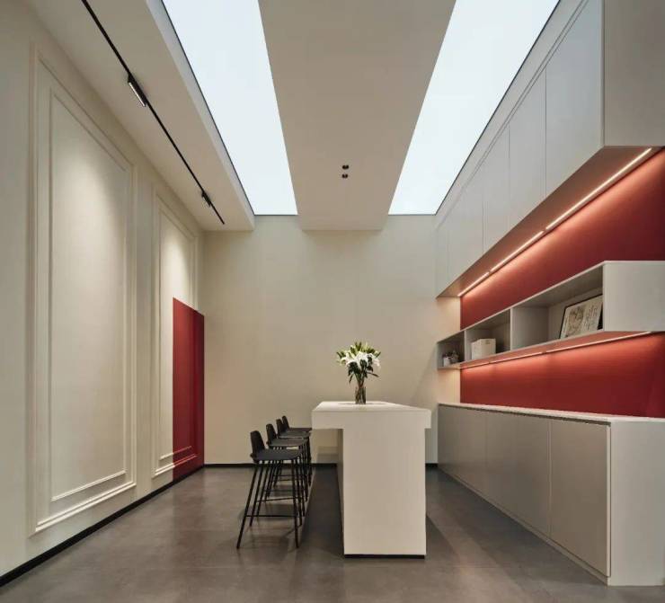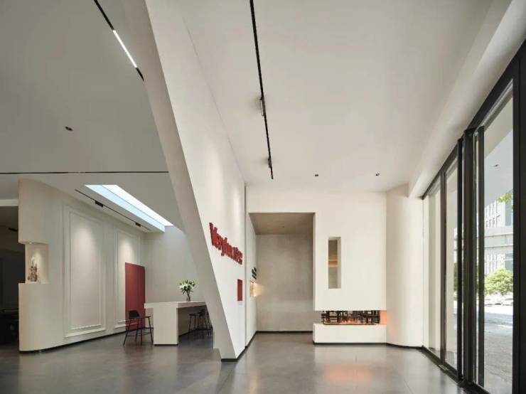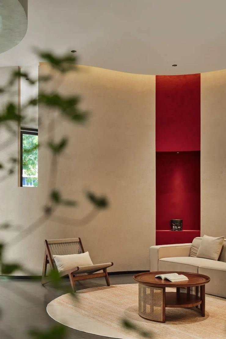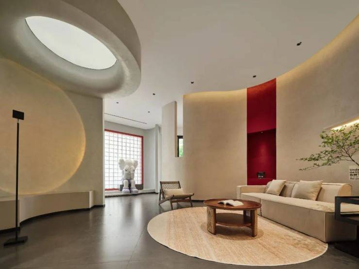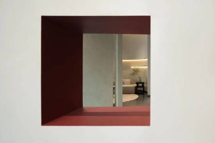 视觉与感官经历色彩的洗礼,在步入接待区后又趋于平静。微水泥肌理的融入,赋予空间特有的哲学与诗意。此外,设计师注重保持室内的通透性,通过有序排列的矩形洞口让光线透进,不仅增强明亮感,还营造一种开放轻盈的氛围,为日常接待、洽谈提供极具松弛感的环境。