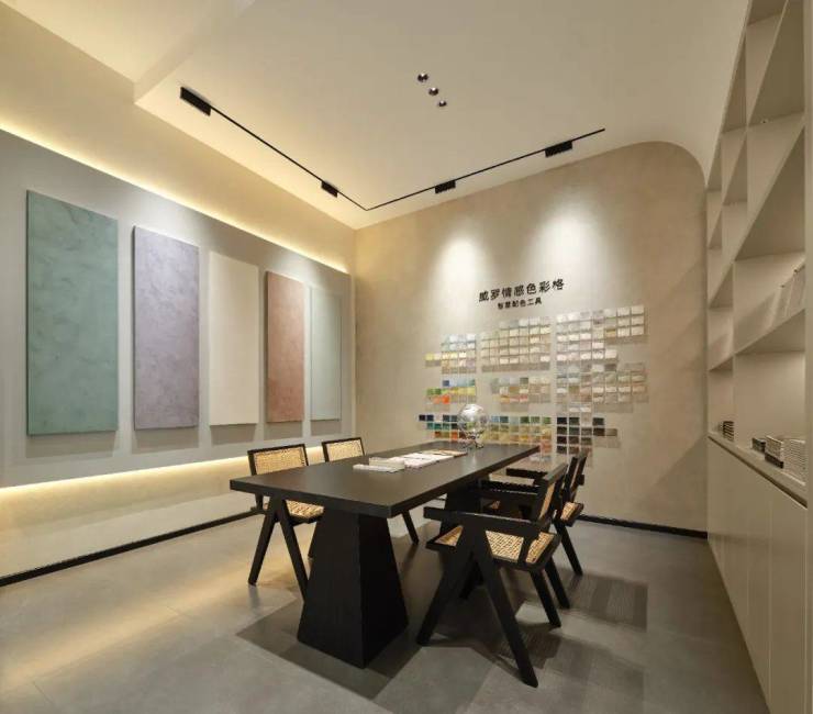 在此空间中,设计师运用VeryLux威罗搪瓷漆(珐琅漆)——英菲尼Infinit涂料,充分发挥艺术涂料(色彩)优势,以威罗情感色彩工具的形式,真实还原艺术涂料实物色彩矩阵,让参观者更能直观感受材料的颜色、触感肌理、适用范围和工艺做法,增加消费者与产品之间的互动与交流。